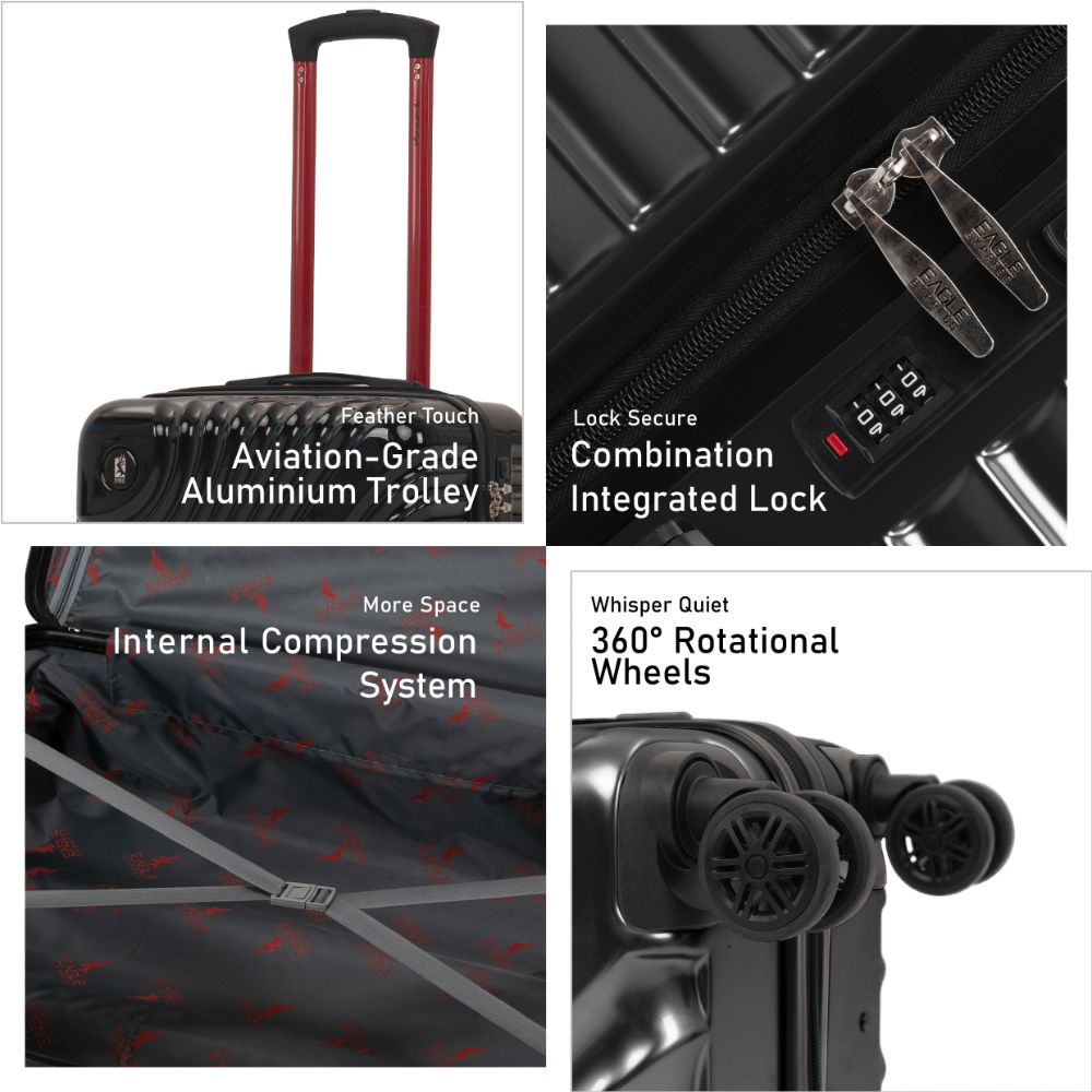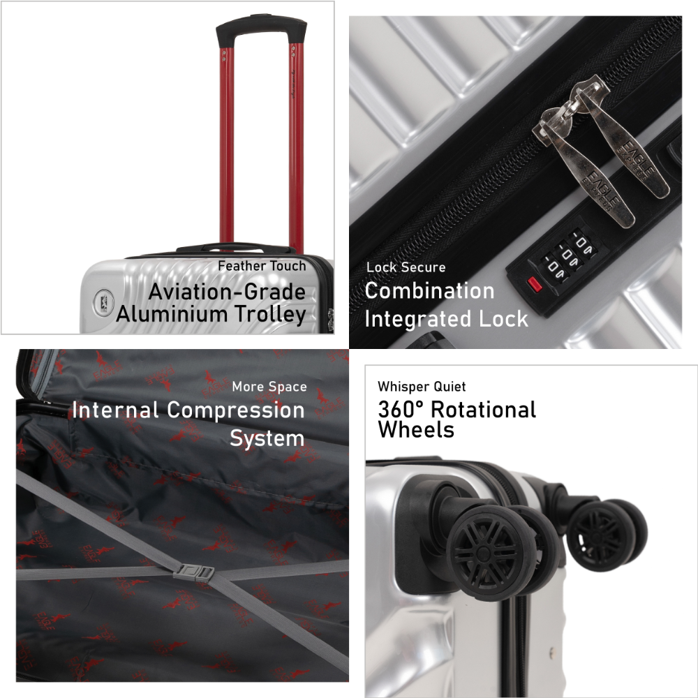 Experience the perfect blend of strength, style, and agility with FALCON Luggage. Crafted from high-impact ABS+PC material, it offers exceptional durability while maintaining a sleek, modern design. The 360° silent double spinner wheels provide effortless movement and stability on any terrain, while the reinforced trolley and soft-grip ergonomic handles ensure complete control with minimal effort. An advanced anti-theft zipper system secures your belongings, making FALCON the ideal companion for travelers who value performance, elegance, and peace of mind.